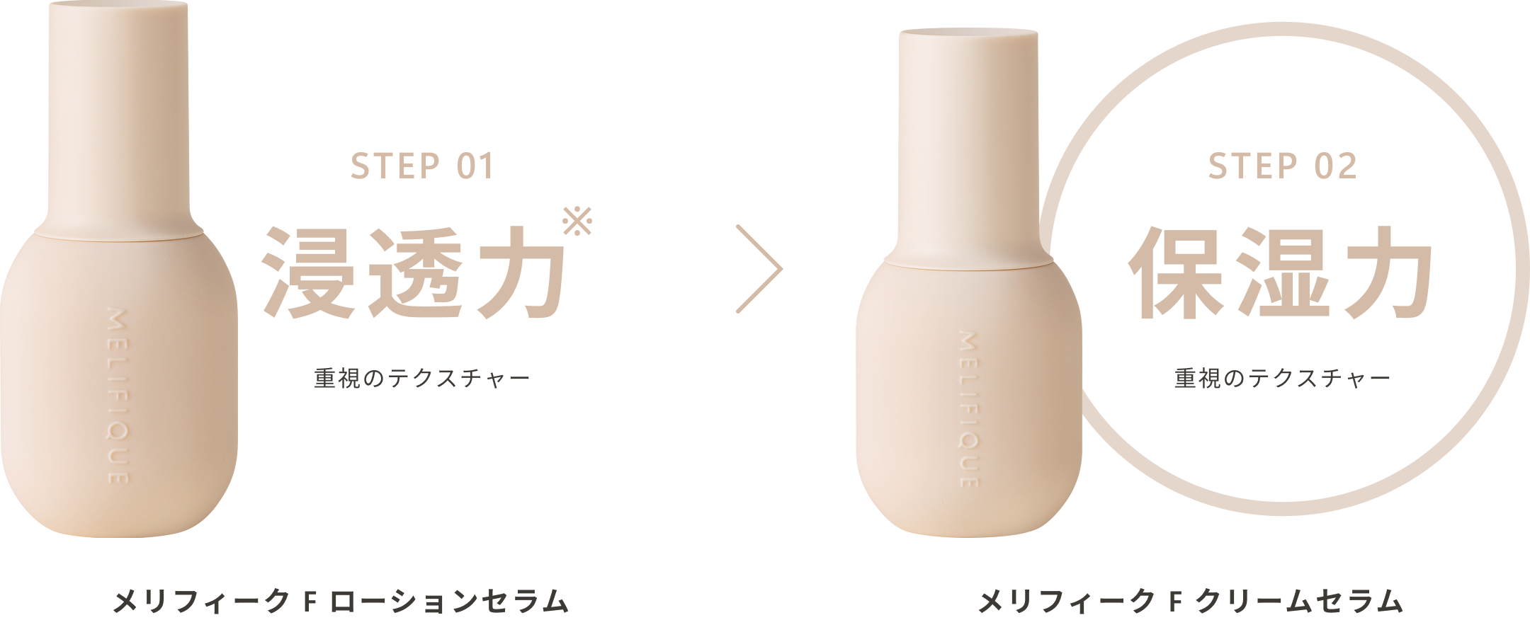 MELIFIQUEのスキンケアは、水分と油分のバランスを最適化するための2STEPケアを採用しています。水分や美容成分を届けるための「ローションセラム」は浸透力重視のテクスチャーに、与えたうるおいを閉じ込めるための「クリームセラム」は保湿力重視のテクスチャーにすることで役割を分担。忙しい毎日でも「満足できるスキンケア」を叶えます。